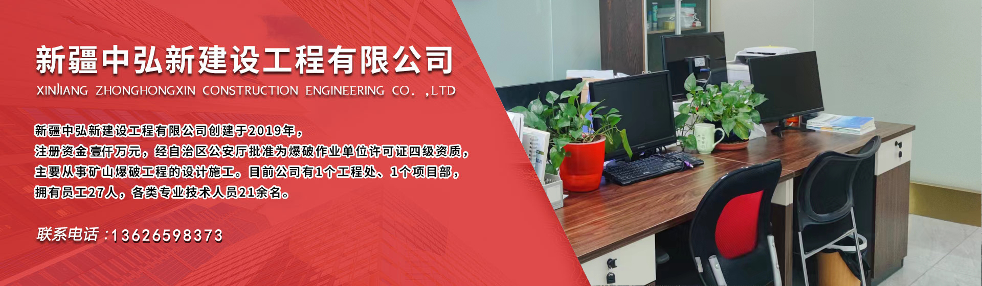 ZHONGHONGXIN CONSTRUCTION ENGINEERING   公 司 簡 介新疆中弘新建設(shè)工程有限公司創(chuàng)建于2019年,注冊資金壹仟萬元,經(jīng)自治區(qū)公安廳批準(zhǔn)為爆破作業(yè)單位許可證四級資質(zhì),主要從事礦山爆破工程的設(shè)計(jì)施工、礦上采掘施工業(yè)務(wù)。目前公司有1個工程處、2個項(xiàng)目部,分...